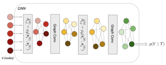 각 노드는 해당하는 데이터의 특징 벡터로 초기화됩니다. 그다음, 특정 노드 V의 이웃 노드에 노드별 거리(유사도)를 곱한 값들의 합(가중평균)을 구합니다. 이를 V와 합쳐 새로운 벡터 V’를 얻습니다. 다른 노드에 대해서도 같은 연산을 순차적으로 반복합니다. 가장 마지막에 쿼리 노드 벡터값의 업데이트도 완료합니다. 모델은 N개의 범주와 완전히 연결된 FC(fully connected layer)층을 통해 쿼리 데이터의 범주를 예측합니다.