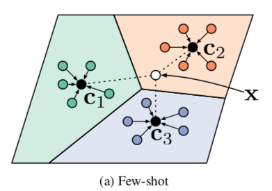 이 논문에서는 범주별 서포트 데이터의 평균 위치인 프로토타입(prototype)이라는 개념을 사용합니다. 결과론적으로 모델은 5개 범주를 대표하는 프로토타입 벡터와 쿼리 벡터와의 거리만 계산하면 됩니다.