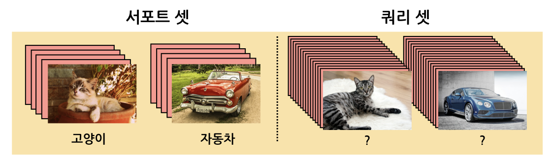 데이터 수가 매우 적은 퓨샷 러닝 문제에서는 데이터셋을 훈련에 사용하는 서포트 데이터(support data)와 테스트에 사용하는 쿼리 데이터(query data)로 구성합니다. 이런 퓨샷 러닝 태스크를 ’N-way K-shot 문제'라고 부릅니다. N은 범주의 수, K는 범주별 서포트 데이터의 수를 의미합니다. 단편적인 예로, [그림 1]처럼 2개의 범주, 범주당 5장의 이미지가 주어진 문제를 2-way 5-shot 문제라고 할 수 있겠습니다.