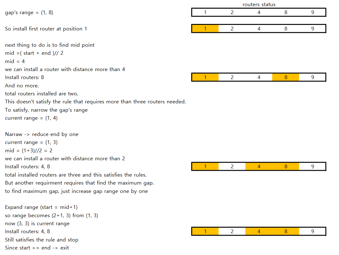 mid = (start + end) // 2 # mid = the gap between two nearest routers.