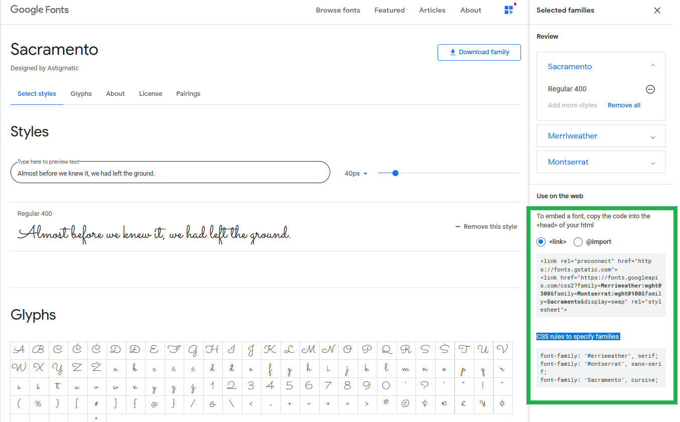 - Copy the CSS rules to specify families in your styles.css file.