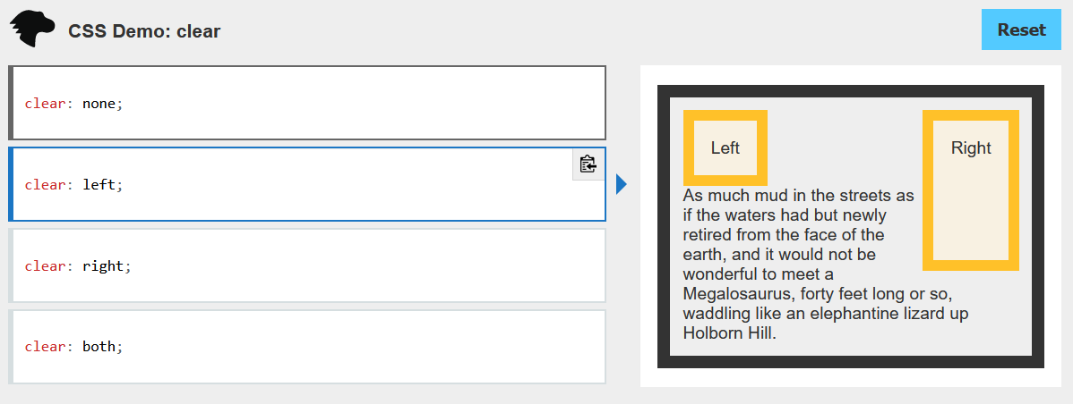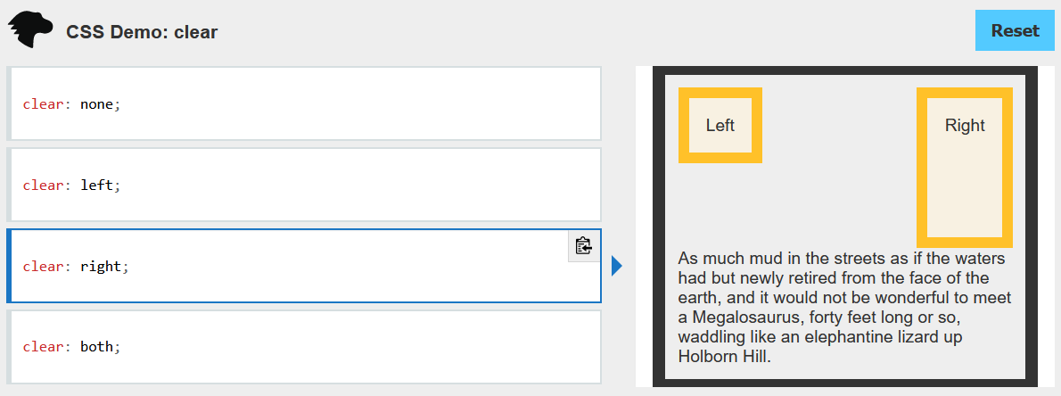 CSS 속성은 요소가 선행 부동(floating) 요소 다음일 수 있는지 또는 그 아래로 내려가(해제되어(cleared))야 하는 지를 지정합니다. clear 속성은 부동 및 비부동 요소 모두에 적용됩니다.